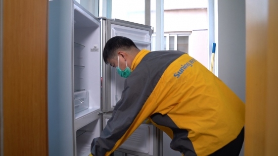 一直以来,苏宁易购坚持送货上门、送装一体,提升消费购买体验。针对服务人员上门,苏宁易购有着更为严苛的防疫要求,末端配送安装服务全过程、全方位消杀。服务前,工作人员进行体温检测,作业工具及个人交通工具的消毒杀菌,上门前的自身消毒;服务中,全程佩戴口罩、手套、鞋套等防护工具,入户出示体温、工作证及健康码,主动与用户保持2米以上安全距离,作业耗材一次性定制专用一户一换;服务后,清洁处理机器、打扫并带走作业垃圾。