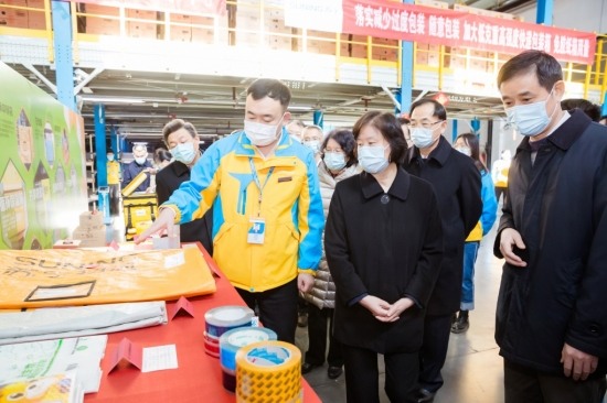 2月22日上午,全国人大常委会副委员长沈跃跃,全国人大常委会委员、环资委主任委员高虎城,全国人大常委会委员、环资委副主任委员窦树华、程立峰,北京市邮政管理局局长王跃等一行参观北京苏宁物流分拣中心调研快递包装绿色转型工作情况,北京苏宁物流总经理胡潘陪同介绍。